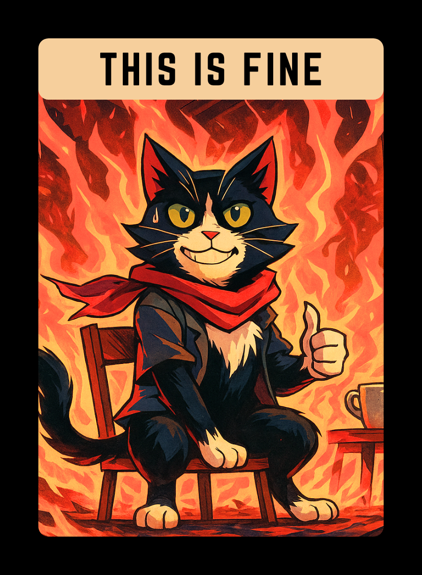 This is for when everything is clearly falling apart, but you’re pretending to stay calm. It’s the quiet nod in the middle of chaos, the mental “sure, why not” as the fire burns around you.